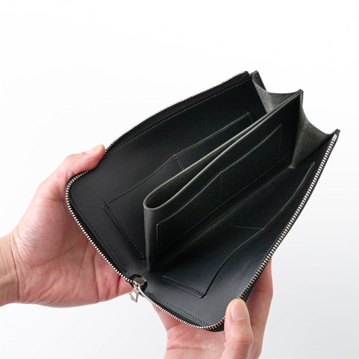 小柄な女性にも手に馴染む大きさの長財布。