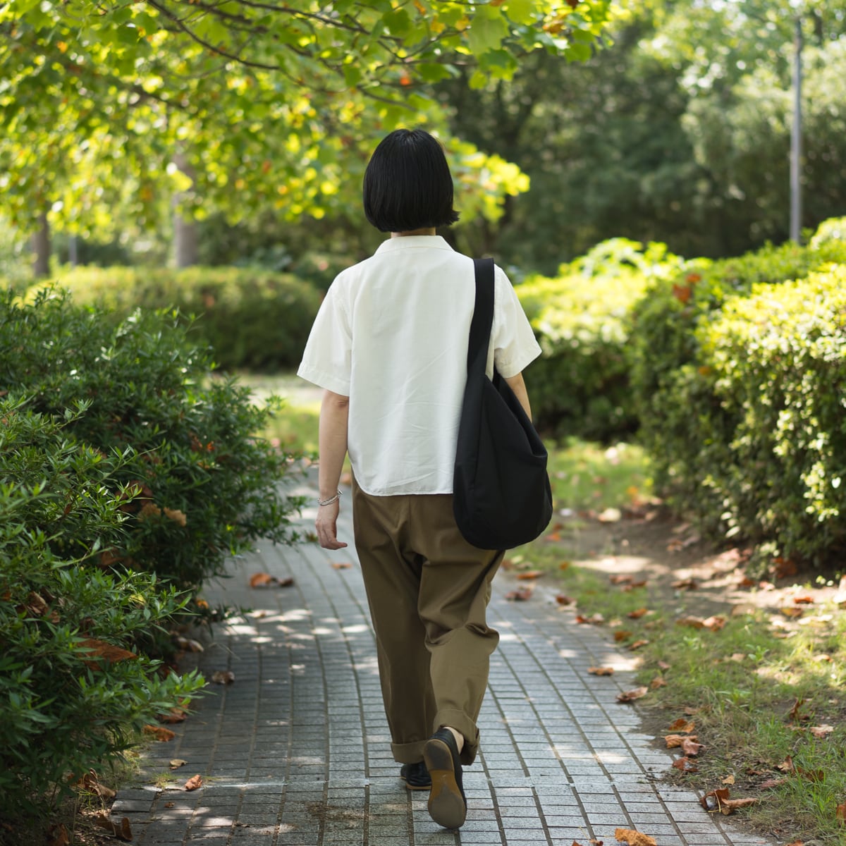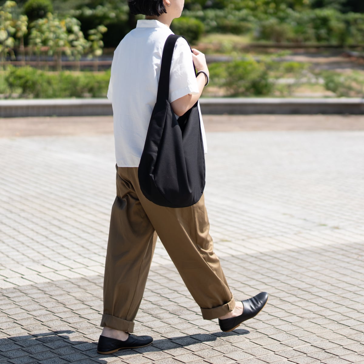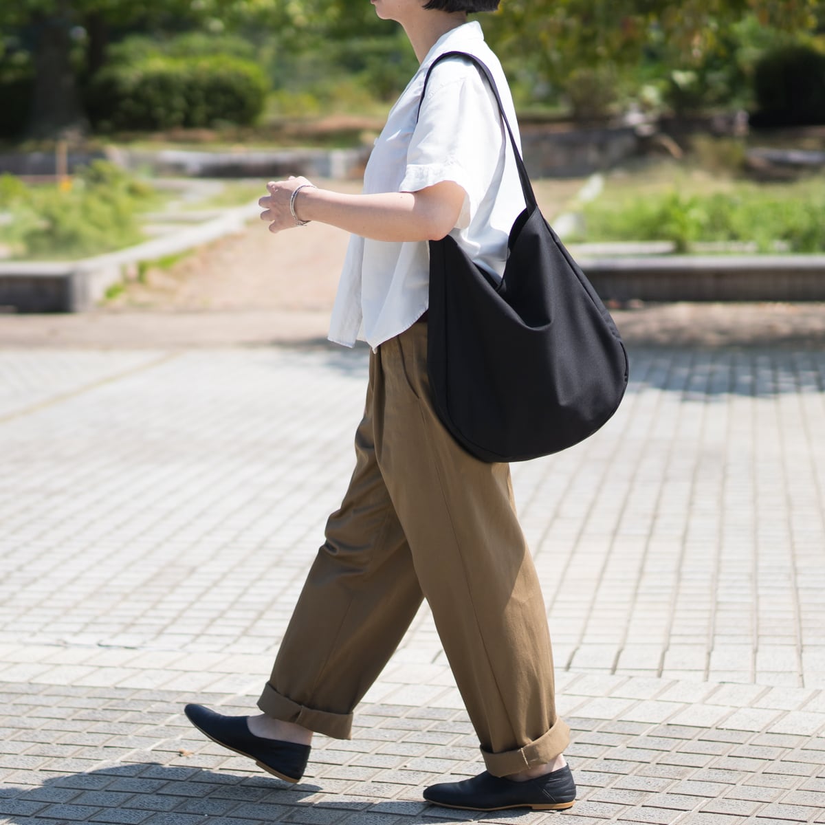 やや光沢のある生地なので、カジュアルになり過ぎず、上品な印象に。