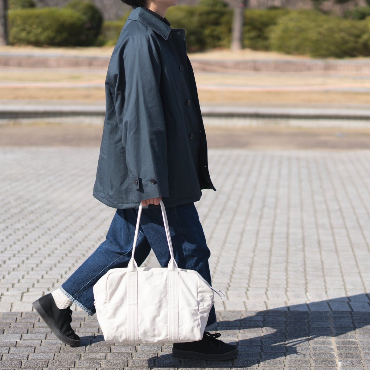 アーミーダック生地を使用した、やや小ぶりなボストンバッグ。